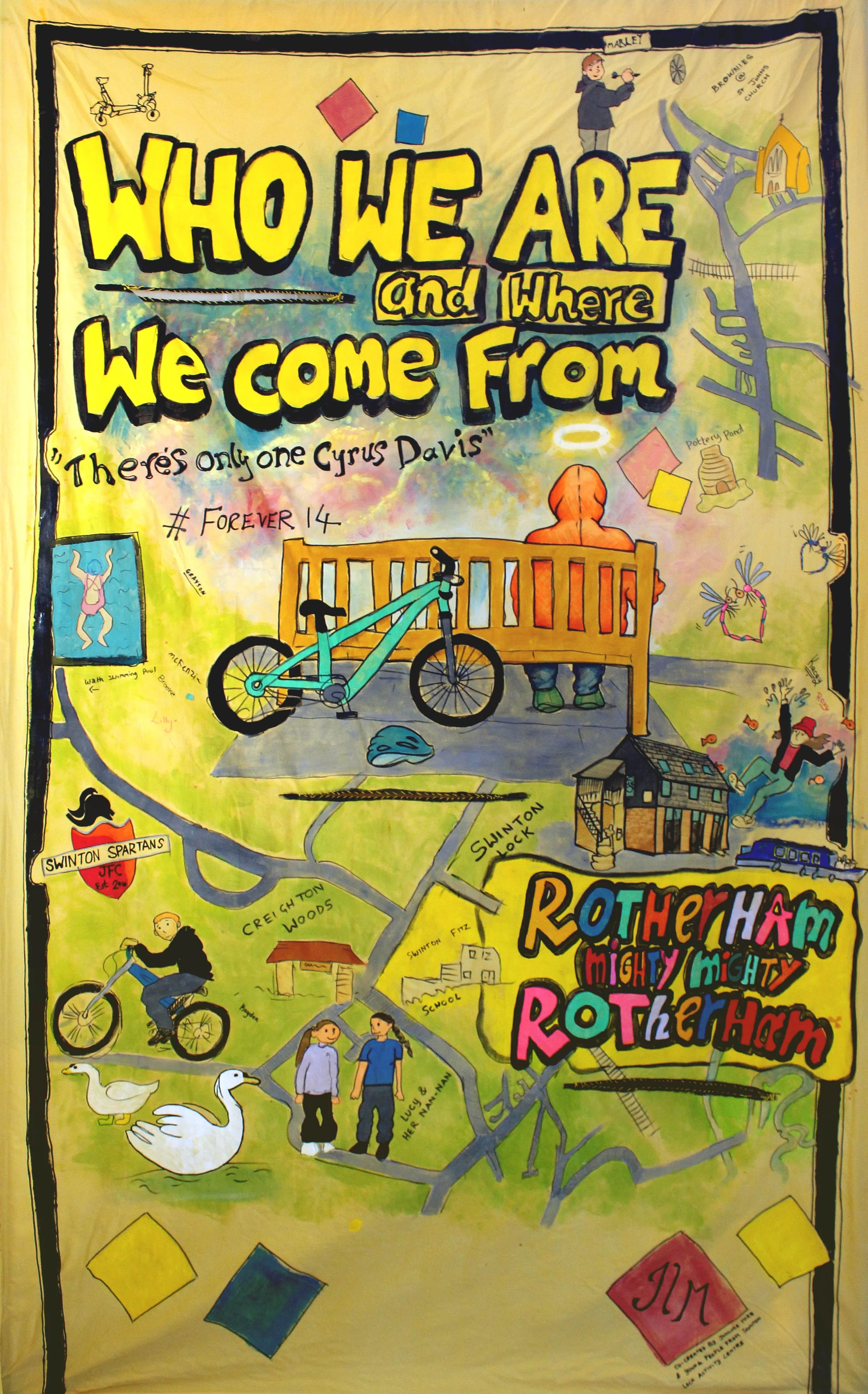 Working with young people from Swinton Lock Activity Centre, this project focussed on the creation of a large-scale parade banner celebrating Rotherham, Swinton and memorialising Cyrus, a friend of the groups who had tragically passed away the previous year.